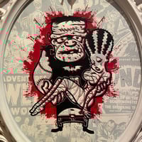 Dieses Motiv habe ich im Jahr 2007 für das amerikanische Horrormagazin "1313" von Kreepsville Industries gezeichnet. Hierbei handelt es sich um einen 3-farbigen Siebdruck auf Leinwand, über einen Karton gespannt. Der Rahmen ist aus Kunststoff, weiß lackiert. Einzelstück!