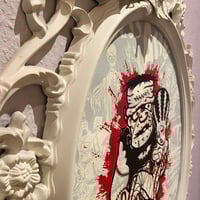 I drew this motif in 2007 for the American horror magazine "1313" by Kreepsville Industries. This is a 3-color screen print on canvas stretched over cardboard. The frame is made of plastic, painted white. unique piece!